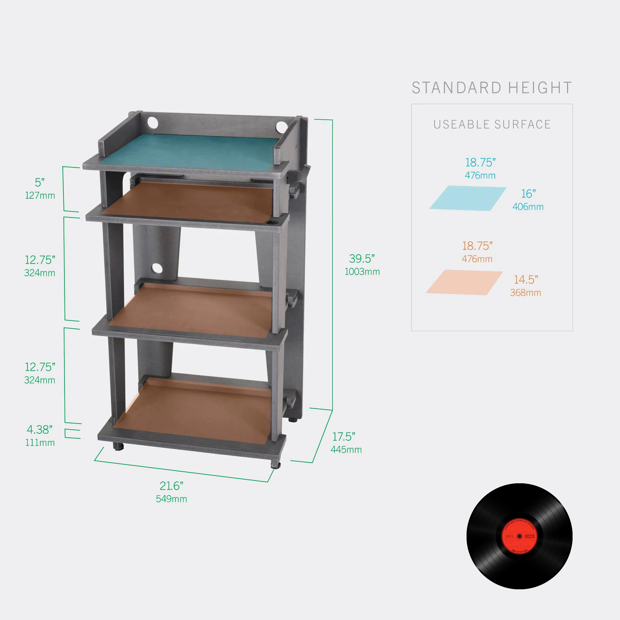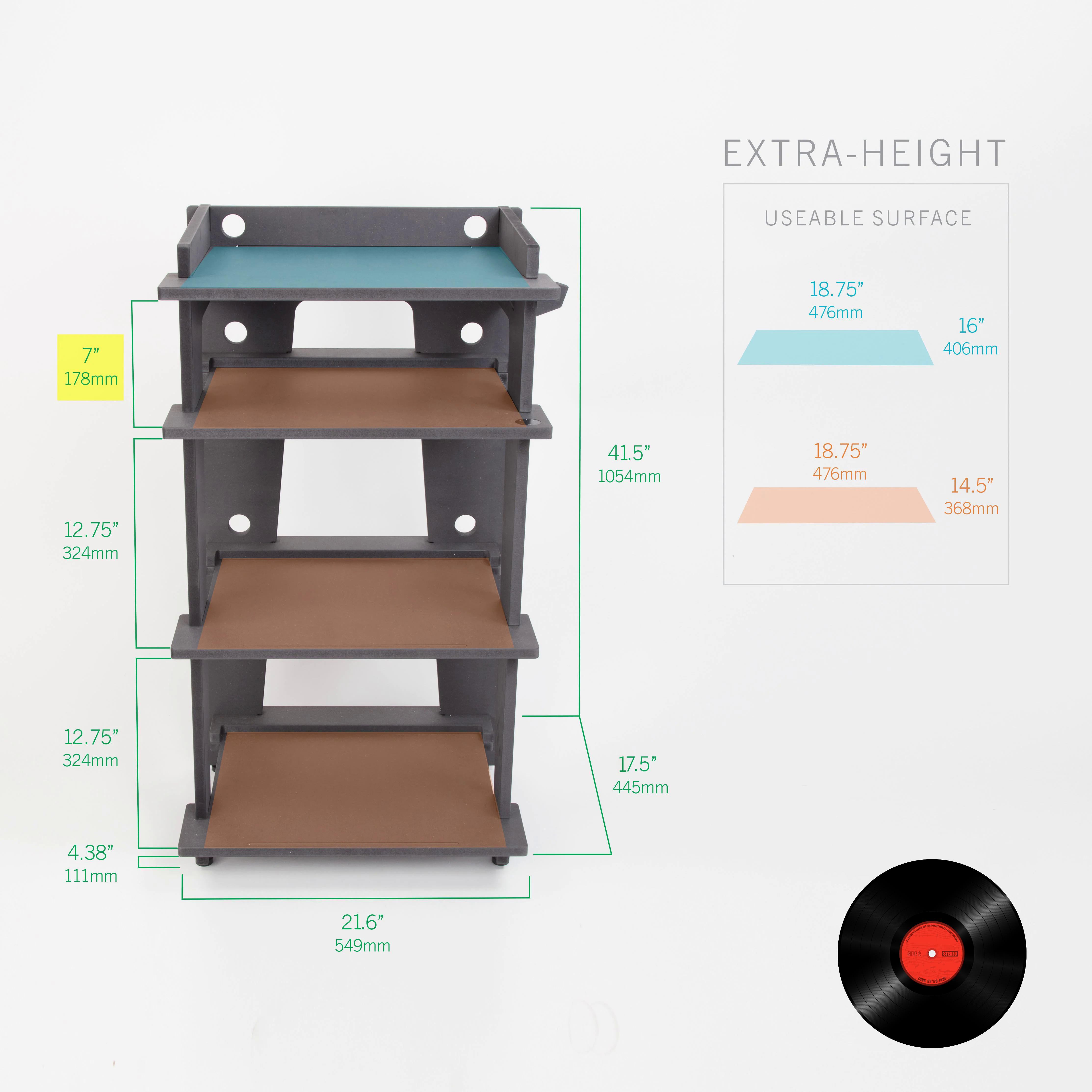 - Standard Height model ➝ 5" accessories shelf / Extra-Height ➝ 7" to accomodate most amplifiers