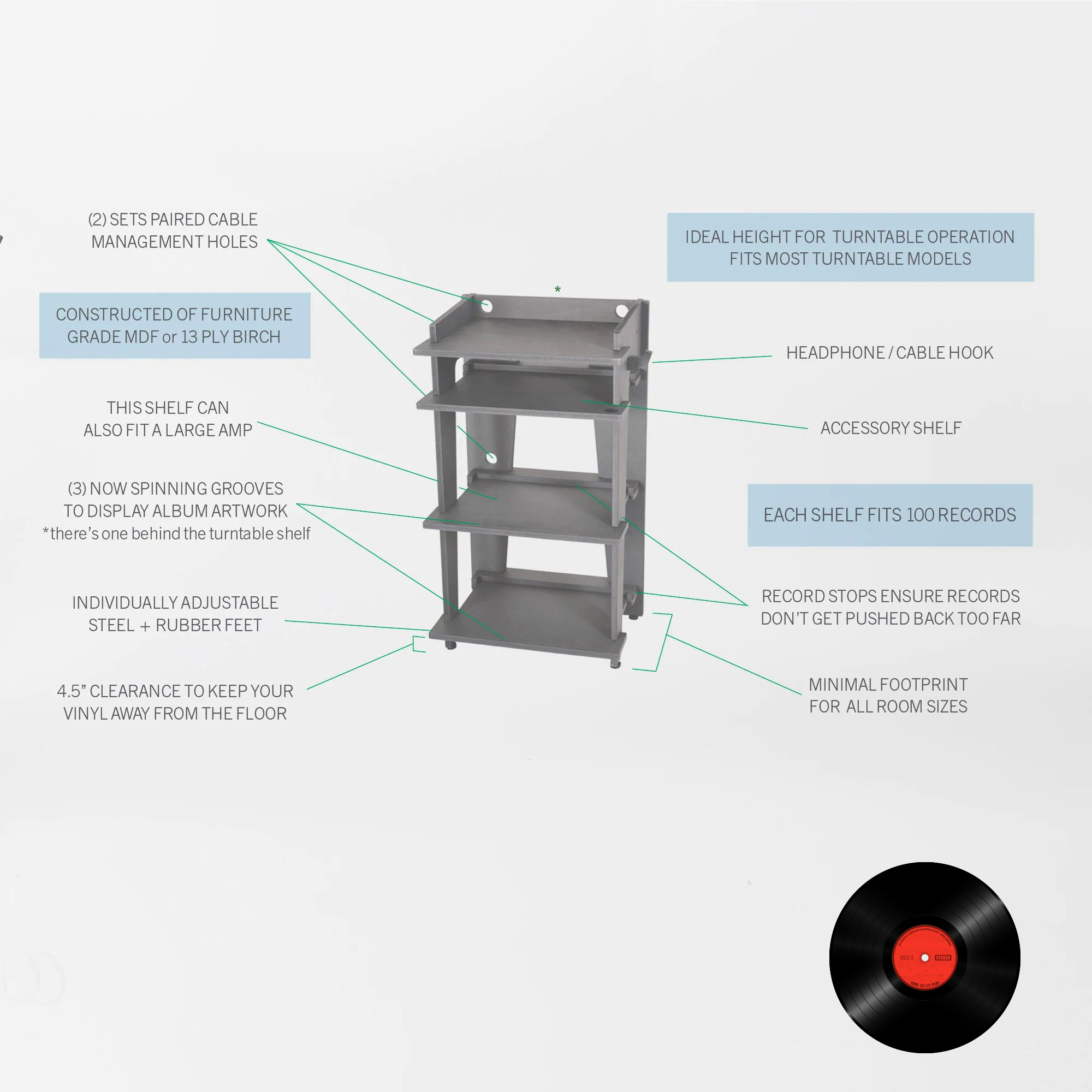 fits most turntables + 200 vinyl records, amp shelf, cable management, now spinning grooves + more